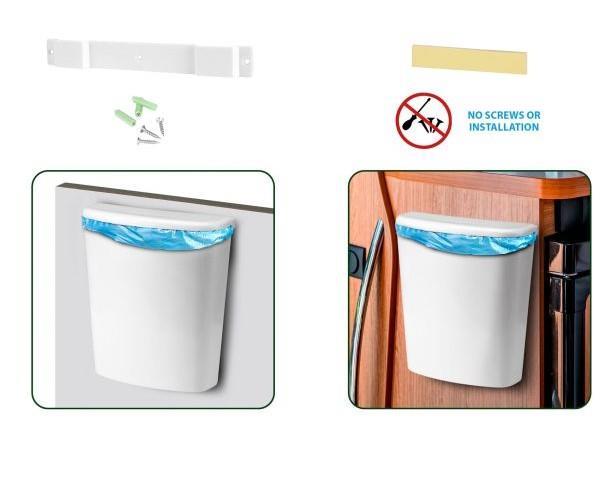Koš s pokrovom. Moderna, funkcionalna oblika. Zelo uporaben za odlaganje manjših odpadkov v avtodomih, prikolicah in čolnih. Pokrov se tesno zapira in preprečuje širjenje neprijetnih vonjav. Izdelano iz visokokakovostne plastike. Enostavna montaža z dvostranskim lepilnim trakom ali vijaki.